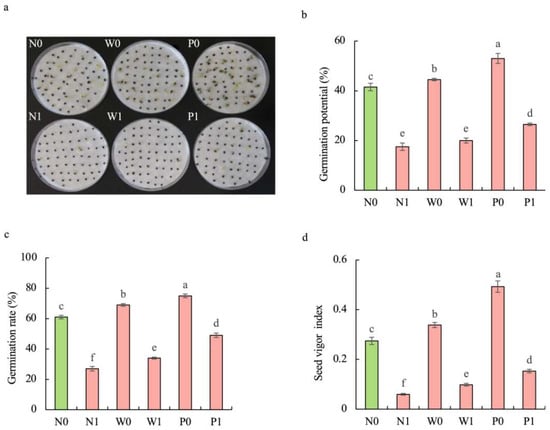Effects of PEG priming on the germination of S. baicalensis seeds in response to salt stress. (a) Phenotype; (b) germination potential; (c) germination rate; (d) seed vigor index. Data represent mean ± SD (n = 3). Bars annotated by different letters indicate statistically significant differences between treatments, as determined by the LSD test at a significance level of p < 0.05. N0: non-priming without salt treatment. N1: non-priming and cultivated with 75 mM of NaCl solution. W0: water priming without salt treatment. W1: water priming and cultivated with 75 mM of NaCl solution. P0: PEG priming without salt treatment. P1: PEG priming and cultivated with 75 mM of NaCl solution.