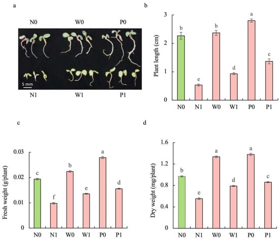 Effects of PEG priming on the growth of S. baicalensis seedling in response to salt stress. (a) Phenotype; (b) plant length; (c) fresh weight; (d) dry weight. Data represent mean ± SD (n = 3). Bars annotated by different letters indicate statistically significant differences between treatments, as determined by the LSD test at a significance level of p < 0.05. N0: non-priming without salt treatment. N1: non-priming and cultivated with 75 mM of NaCl solution. W0: water priming without salt treatment. W1: water priming and cultivated with 75 mM of NaCl solution. P0: PEG priming without salt treatment. P1: PEG priming and cultivated with 75 mM of NaCl solution.