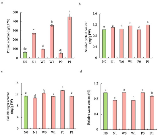 Effects of PEG priming on the osmolyte content and relative water content (RWC) of S. baicalensis shoots in response to salt stress. (a) Proline content; (b) soluble protein content; (c) soluble sugar content; (d) RWC. Data represent mean ± SD (n = 3). Bars annotated by different letters indicate statistically significant differences between treatments, as determined by the LSD test at a significance level of p < 0.05. N0: non-priming without salt treatment. N1: non-priming and cultivated with 75 mM of NaCl solution. W0: water priming without salt treatment. W1: water priming and cultivated with 75 mM of NaCl solution. P0: PEG priming without salt treatment. P1: PEG priming and cultivated with 75 mM of NaCl solution.