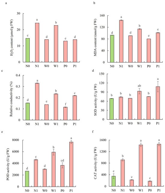 Effects of PEG priming on lipid peroxidation, membrane permeability, and enzymatic antioxidant activity of S. baicalensis shoots in response to salt stress. (a) H2O2 content; (b) MDA content; (c) relative electrical conductivity (REC); (d) SOD activity; (e) POD activity; (f) CAT activity. Data represent mean ± SD (n = 3). Bars annotated by different letters indicate statistically significant differences between treatments, as determined by the LSD test at a significance level of p < 0.05. N0: non-priming without salt treatment. N1: non-priming and cultivated with 75 mM of NaCl solution. W0: water priming without salt treatment. W1: water priming and cultivated with 75 mM of NaCl solution. P0: PEG priming without salt treatment. P1: PEG priming and cultivated with 75 mM of NaCl solution.