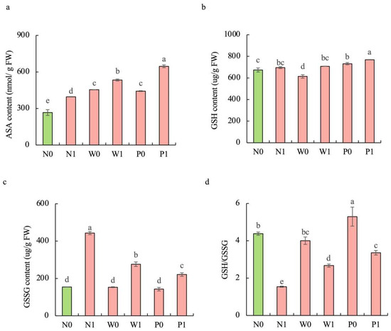 Effects of PEG priming on the non-enzymatic antioxidant content of S. baicalensis shoots in response to salt stress. (a) AsA content; (b) GSH content; (c) GSSG content; (d) GSH/GSSG ratio. Data represent mean ± SD (n = 3). Bars annotated by different letters indicate statistically significant differences between treatments, as determined by the LSD test at a significance level of p < 0.05. N0: non-priming without salt treatment. N1: non-priming and cultivated with 75 mM of NaCl solution. W0: water priming without salt treatment. W1: water priming and cultivated with 75 mM of NaCl solution. P0: PEG priming without salt treatment. P1: PEG priming and cultivated with 75 mM of NaCl solution.