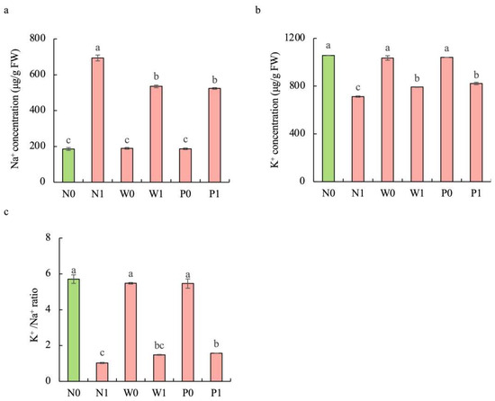 Effects of PEG priming on the Na+ content, K+ content, and K+/Na+ ratio of S. baicalensis shoots in response to salt stress. (a) Na+ content; (b) K+ content; (c) K+/Na+ ratio. Bars annotated by different letters indicate statistically significant differences between treatments, as determined by the LSD test at a significance level of p < 0.05. N0: non-priming without salt treatment. N1: non-priming and cultivated with 75 mM of NaCl solution. W0: water priming without salt treatment. W1: water priming and cultivated with 75 mM of NaCl solution. P0: PEG priming without salt treatment. P1: PEG priming and cultivated with 75 mM of NaCl solution.