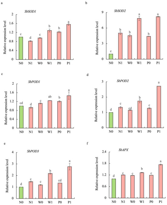 Effects of PEG priming on the transcription levels of antioxidant-related genes of S. baicalensis shoots in response to NaCl stress. (a) SbSOD1; (b) SbSOD2; (c) SbPOD1; (d) SbPOD2; (e) SbPOD3; (f) SbAPX. Data represent mean ± SD (n = 3). Bars annotated by different letters indicate statistically significant differences between treatments, as determined by the LSD test at a significance level of p < 0.05. N0: non-priming without salt treatment. N1: non-priming and cultivated with 75 mM of NaCl solution. W0: water priming without salt treatment. W1: water priming and cultivated with 75 mM of NaCl solution. P0: PEG priming without salt treatment. P1: PEG priming and cultivated with 75 mM of NaCl solution.