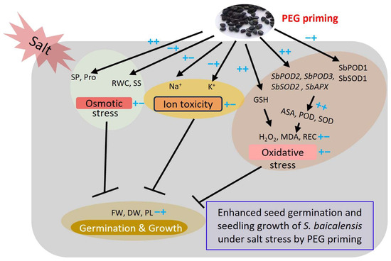 Working model of enhanced seed germination and seedling growth of S. baicalensis under salt stress induced by PEG priming. ++ or −− refers to the strong increase or decrease treated by both salt stress and PEG priming, respectively. +− indicates the initial increase by salt stress and subsequent decrease caused by PEG priming. −+ indicates the initial decrease by salt stress and subsequent increase by PEG priming. SOD, POD, CAT, PEG, Pro, RWC, GSH, AsA, REC, MDA, FW, DW, SP, SS, and PL are the abbreviations of superoxide dismutase, peroxidase, catalase, polyethylene glycol, proline, relative water content, glutathione, ascorbic acid, relative electrical conductivity, malondialdehyde, fresh weight, dry weight, soluble protein, soluble sugar, and plant length, respectively.