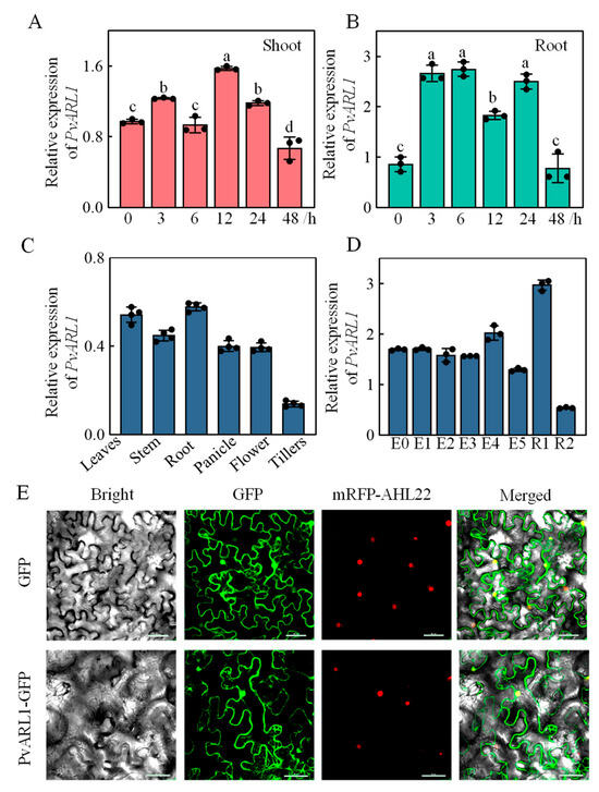 Expression patterns of PvARL1 and subcellular localization. (A,B): Expression levels of PvARL1 transcripts in shoots (A) and roots (B) under a series time-course of alkali treatment. Fourteen-day-old “Alamo” seedlings were transferred to 1/4 Hoagland solution with or without 150 mM Na+, NaHCO3:Na2CO3 = 9:1 from 3 h to 48 h. Data are the means of three biological replicates (±SD). Different letters represent statistically significant differences as indicated by Duncan analysis by SPSS 23 software. (C,D): Expression patterns of PvARL1 in different tissues (C) and leaves at different development stages (D). E0–E5, the youngest leaf of plants at the 5-elongation vegetative stage; R1–R2 indicate the flag leaf at different reproductive stages (Hardin et al., 2013) [21]. (E): Subcellular localization of PvARL1. Nuclear protein AHL22 was used as a nuclear localization marker. Bars = 50 µm.