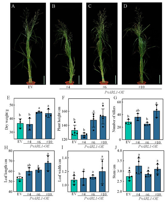 Phenotypes of overexpressing PvARL1 transgenic switchgrass lines. (A–D): Phenotypes of the R3-stage empty vector (EV) and three independent transgenic lines overexpressing PvARL1. Bars = 15 cm. (E–J): Total aboveground dry weight of the R3 stage (E), plant height of the R3 stage (F), tillers (G), length of the third leaf from the top (H), width of the third leaf (I), and stem diameter of the second internode from the base (J). Different letters represent statistically significant differences as indicated by Duncan’s test calculated by SPSS 23 software.