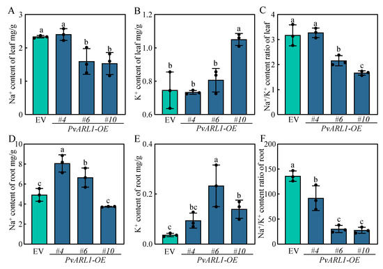 It is well known that abiotic stresses destroy cell membrane integrity, indicated by electrolyte leakage. No differences existed in electrolyte leakage in leaves between the EV and PvARL1-OE transgenic plants under control growth conditions. In contrast, electrolyte leakage was significantly lower in all three PvARL1-OE overexpressed lines than in EV plants after alkali treatment (Figure 4F).