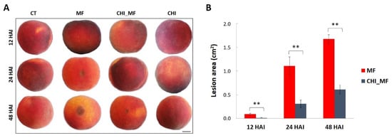 Disease severity of peach fruits against M. fructicola. (A) Brown rot symptoms of peach fruits with (CHI_MF) and without (MF) chitosan pre-treatment at 12, 24, and 48 HAI. Peach fruits treated only with chitosan (CHI) and untreated–mock-inoculated (CT) fruits were used as control groups (scale bar: 30 mm). (B) Lesion area (cm2) on untreated peach fruits after inoculation with M. fructicola (MF) and on peach fruits inoculated with M. fructicola after chitosan pre-treatment (CHI_MF). Bars represent the mean of 3 biological replicates ± standard deviation after t-test analysis. Asterisks indicate statistically significant differences between MF and CHI_MF treatments at each inoculation time point (p < 0.01).