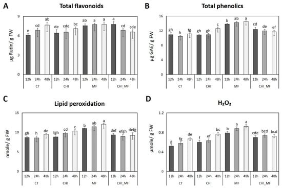An immediate response of plants to biotic stress is the production of antioxidant secondary metabolites like phenolic and flavonoid compounds, in order to reduce lipid peroxidation and H2O2 accumulation, as a response to oxidative stress. The level of flavonoid compounds in CT and CHI treatments increased progressively with time, reaching the highest amount at 48 HAI. However, in MF treatment the total flavonoids were higher than in other treatments through all the sampling (Figure 2A), reaching the most significant, highest amount at 48 HAI. In CHI_MF treatment, the amount of total flavonoids reached its highest value at 12 HAI and declined progressively over time to 6.6 μg g−1 FW.