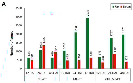 (A) Gene number of up/downregulated DEGs among the three different comparison groups (CHI–CT, MF–CT, CHI_MF–CT) at 12, 24, and 48 HAI. (B) Venn diagram showing DEGs commonly regulated across the three time points for each comparison group; CHI: chitosan-treated fruits, MF: M. fructicola-inoculated fruits, CHI_MF: chitosan-pre-treated and M. fructicola-inoculated fruits, CT: untreated–mock-inoculated fruits.