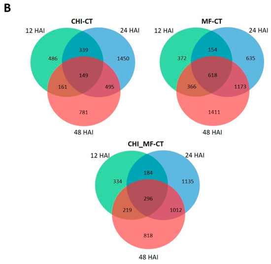 For the MF_CHI-CT comparison group, at 12 HAI genes associated with molecular functions such as “fatty acid biosynthetic process” and “fatty acid metabolic process” were mostly upregulated, whereas “defense response” and “response to biotic stimulus” only increased with a delay, as in the MF-CT comparison group. DEGs associated with photosynthesis-related GO terms were upregulated mostly at 24 HAI. Furthermore, DEGs associated with molecular functions such as “oxidoreductase activity”, “transcription regulator activity”, and “cofactor binding” were mostly upregulated at 12 HAI, followed by a progressive upregulation of DEGs associated with similar GO terms from 24 up to 48 HAI. Notably, DEGs associated with “polysaccharide binding” and “chitinase activity” were mostly upregulated at 48 HAI (Figure S3C).