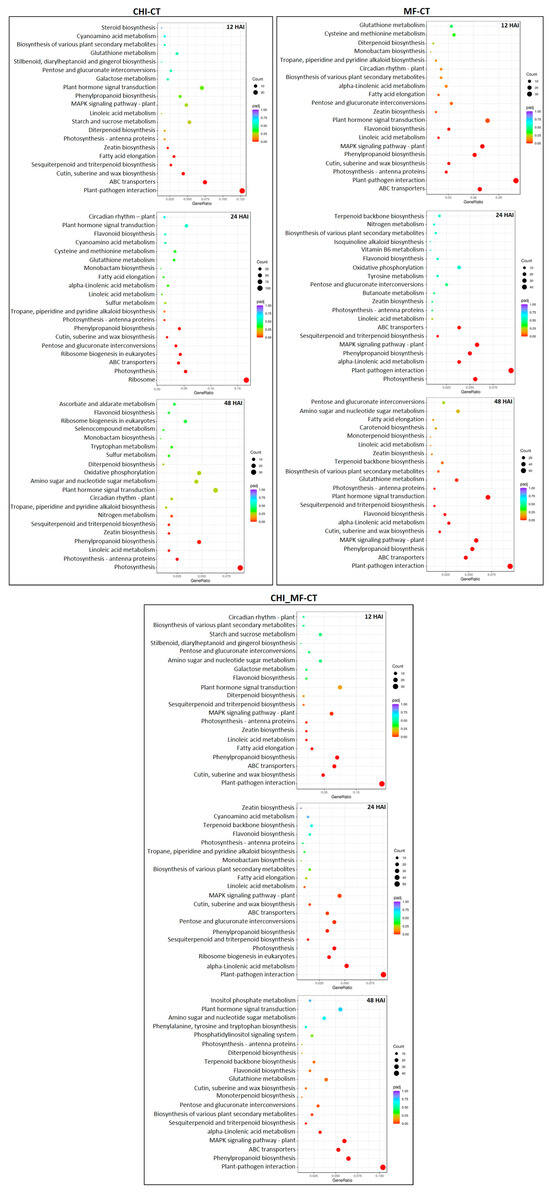 Finally, in MF_CHI-CT as in the MF-CT group, “plant–pathogen interaction” was the highest upregulated pathway with the number of related DEGs being increased from 12 HAI up to the late time point. Nevertheless, the number of relevant DEGs was slightly lower, with induction rates that were less pronounced when compared to the MF-CT group at the respective time points. Pathways related to the induction of defense responses, such as “ABC transporters”, “phenylpropanoid biosynthesis”, “sesquiterpenoid and triterpenoid biosynthesis”, “alpha-Linolenic acid metabolism”, and “MAPK signaling pathway” were constitutively enriched at all time points, but mostly at 48 HAI. While photosynthesis-related pathways were significantly upregulated at 12 and 24 HAI, the “fatty acid elongation” pathway was upregulated early at 12 HAI, similar to the CHI-CT group (Figure 4).