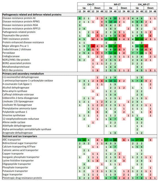 Our RNA-seq data indicated that, in the CHI-CT group, DEGs encoding types of PR proteins were only spatially induced across the time period. This expression profile was only slightly altered in the case of endochitinase and thaumatin encoding DEGs, with nine and five members being upregulated at 48 HAI, respectively, as well for DEGs encoding Pru ar (major allergen Pru ar 1) with 14 members being downregulated at 12 HAI and seven members being upregulated at 48 HAI. On the contrary, in the MF-CT group a plethora of various PRs were upregulated, particularly at 48 HAI, such as DEGs encoding endochitinase (PR-3), endoglucanase (PR-2), peroxidase (PR-9), metalloendoproteinase 2-MMP (PR-10), Pru ar (PR-10), and thaumatin (PR-5). Furthermore, DEGs encoding members of disease-resistance proteins of the NHL (NDR1/HIN1), RPM1, RPP13, MLO families, and BON1-associated proteins (BAPs) were also highly upregulated at 48 HAI. In the CHI_MF-CT group, the expression patterns were similar to those of DEGs of the MF-CT group, whilst slightly less DEGs were induced along with lower induction rates (Figure 5; Table S7).