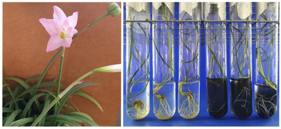 The Amaryllidaceae family is known for its ornamental potential and the ability to synthesize several alkaloids, including galantamine and lycorine, and potent acetylcholinesterase (AChE) inhibitors, used to alleviate the symptoms of Alzheimer’s Disease (AD) []. However, some species in this family are poorly represented, have a low multiplication rate [] and are vulnerable or at risk of extinction []. Among the species in this family, Zephyranthes irwiniana (Ravenna) Nic. García (Figure 1) is endemic to the Brazilian savanna (Cerrado), classified as Vulnerable in terms of extinction threat []. Few studies have evaluated the biological properties of this species [], but there is no record of its traditional and medicinal use in Brazil and no studies on its propagation or phytochemistry under controlled conditions.