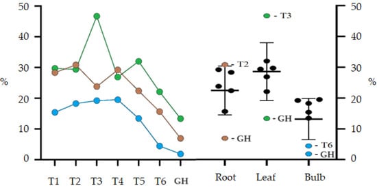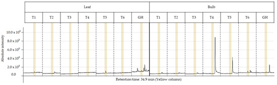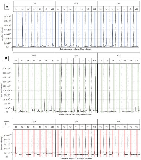 Root extracts presented the two highest relative abundances of 14.34% and 13.94%, respectively, for T6 and T4, being significantly higher than the other extracts. Treatments T2 and T5 presented the lowest abundances, and both were within the confidence interval. The other treatments were statistically equal. Bulb treatments T2–T5 presented relative abundance between 1.00% and 2.00%, and significantly higher values were obtained in the treatments T1 (5.60%) and T6 (4.58%). In general, the T6 treatment presented the best results, as for the bulb and root it was statistically superior to the others; for the leaf, it presented the second highest abundance. The GH treatment presented the highest abundance of ethanolic extracts in the leaves, at 11.62%, and the lowest abundance in the roots (0.73%). Interestingly, treatment T1 also showed good results in general terms, similar to T6; however, the composition of the culture media differs in the concentration of sucrose and the use of AC. T6 was higher only in the root extract and T1 in the leaf and bulb extract.