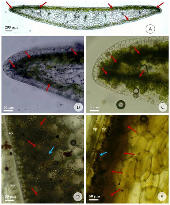 Reactions of fresh leaves and bulbs of Zephyranthes irwiniana (cross sections) submitted to the histochemical tests; red arrows indicate presence of alkaloids; blue arrows indicate the starch grains. (A–C) detail of presence of alkaloids in the leaf margins, just below the adaxial and abaxial epidermis; (D,E) detail of presence of alkaloids in the bulbs in the region adjacent to the epidermis that faces the outside of each cataphyll; (A,B,D) Dragendorff’s test; (C,E) test with Wagner’s reagent. (ep: epidermis).