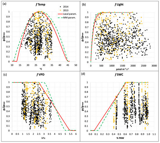 Limiting functions for gs due to (a) temperature, (b) PAR, (c) VPD, and (d) SWC for the local parameterization (red line) defined with local gs measurements, and the generic parameterization reported by the Mapping Manual (green dotted line) for durum wheat. Yellow and black dots represent the gs measurements performed in 2013 and 2014, respectively.