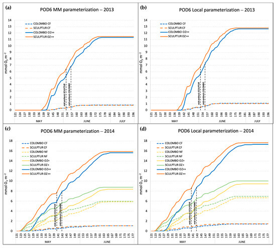 In both experiments, Sculptur entered the anthesis stage 3 days before Colombo (Table 2), and this affected the POD6 accumulation period which is based on the thermal sum value (expressed in °C day, Table 1) calculated backward and onwards from the mid-anthesis date. The accumulation patterns of the POD6 in 2013 and 2014, according to the different O3 treatments, cultivars, and gs model parameterizations, are shown in Figure 3.