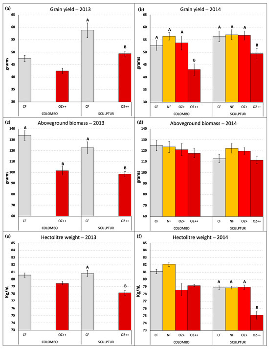 Regarding the hectolitre weight, which can be considered as a grain quality indicator, the results obtained in 2014 confirmed what was already observed in 2013 (Figure 4e,f). Sculptur showed a statistically significant decrease in the OZ++ treatment (−3.2% p = 0.038 and −4.1% p = 0.000 in 2013 and 2014, respectively), while Colombo plants were not statistically affected, although in both years the values tended to decrease in O3 treated plants (−1.4% and −2.4% in 2013 and 2014, respectively, for the OZ++ treatment). Also, in this case, the intermediate O3 treatments applied in 2014 did not show any particularly different behavior compared to CF plants, with the sole exception of Colombo OZ+ plants that showed a marked decrease in the hectolitre weight, even greater than the OZ++ plants (−3.1%, Figure 4f).