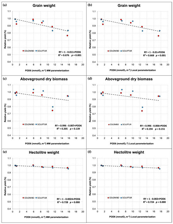 In the case of grain yield, the use of the local gs parameterization leads to a dose–response relationship predicting a relative loss of −1% for each unit of POD6 absorbed during the accumulation period (Figure 5b). With the MM parameterization, however, the predicted loss was slightly higher, −1.1% for each unit of POD6. The same situation applies to the relative decrease in hectolitre weight, which was −0.20% and −0.24%, respectively, for the relationship based on local parameterization and on the MM parameterization.