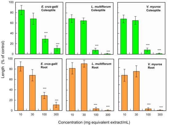 - Macías, F.A.; Molinillo, J.M.G.; Varela, R.M.; Galindo, J.G.G. Allelopathy—A natural alternative for weed control. Pest Manag. Sci. 2007, 63, 327–348. [Google Scholar] [CrossRef] [PubMed]
