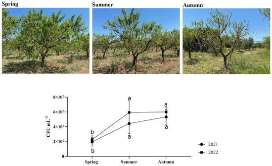 CFU mL−1 of Xf-positive almond plants sampled in this study. Statistical analysis was carried out by ANOVA followed by the Tukey HSD post hoc test. Different letters correspond to statistically different means.