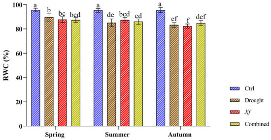 Relative water content (RWC) determined on cv. “Filippo Ceo” leaves subjected to drought, Xylella fastidiosa and combined over a two-year period of observation. Statistical analysis was carried out by ANOVA followed by the Tukey HSD post hoc test. Different letters correspond to statistically different means.