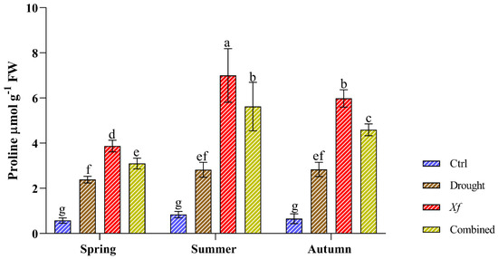 Compared with those of the control, the stress conditions significantly increased the content of free proline (Figure 3). Water deficit led to similar proline accumulation patterns regardless of the sampling period, with an average 3.46-fold increase compared to that of the control. Most strikingly, more proline accumulated in response to Xf. Our data showed an average increase of 8.14-fold compared to the control conditions. This trend was confirmed in all sampling seasons. The simultaneous action of drought and pathogen led to an average 6.43-fold increase compared to the non-stressed plants, higher than the water stress but lower than the pathogen alone.