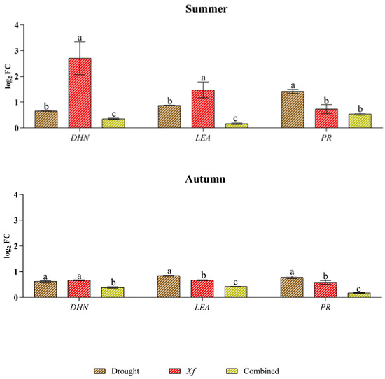 Expression analysis of dehydrin (DHN), the late embryogenesis-abundant protein (LEA) pathogenesis-related protein (PR) in leaves of cv “Filippo Ceo” subjected to different stress factors: drought, pathogen Xylella fastidiosa and a combination of both (spring, summer and autumn) in two-year observations, expressed as log2 fold change (log2 FC). One-way ANOVA with Tukey’s HSD post hoc test was used for the statistical analysis. Different letters correspond to significantly different means.