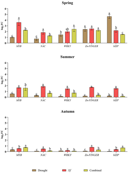 Expression analysis of transcription factors (TFs) involved in the regulation of defence and responses to different stress factors in plants: dehydration-responsive element binding myeloblastosis (MYB); NAC; WRKY; Zn finger; basic leucine zipper (bZIP); in leaves of cv “Filippo Ceo” subjected to stresses: drought, pathogen Xylella fastidiosa combination of both (spring, summer and autumn) in two-year observations, expressed as log2 fold change (log2 FC). One-way ANOVA with Tukey’s HSD post hoc test was used for the statistical analysis. Different letters correspond to statistically different means.