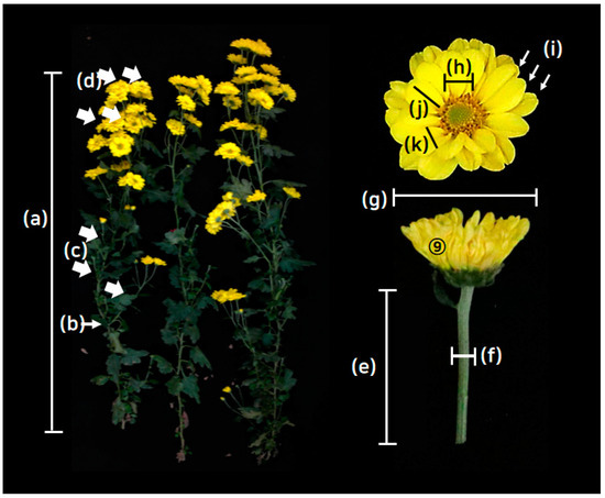 Visual description of the phenotypic evaluations for the horticultural traits of chrysanthemum breeding lines used in this study. (a) Plant height (PH, cm), (b) stem diameter (SD, mm), (c) no. of side branches (NOSB, each), (d) no. of flowers (NOF, each), (e) flower stem length (FSL, mm), (f) flower stem diameter (FSD, mm), (g) overall flower diameter (FD, mm), (h) disk flower diameter (DFD, mm), (i) volume of flower (VF, 1~6 scales), (j) ray floret length (RFL, mm), (k) ray floret width (PW, mm). The unit and abbreviation of each phenotypic assessment is indicated in the parenthesis in a–k. The chrysanthemum line shown in the figure is ‘Yes holic’, as indicated in no. 64 of Table S2. The arrows indicate the specific areas or positions for the phenotypic evaluations. Detailed methods are described in Table S3.
