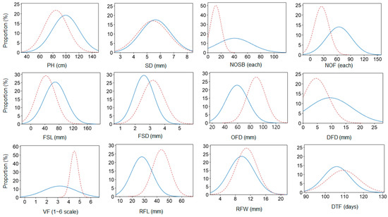 Density curve of the selected horticultural traits for standard and spray chrysanthemum breeding accessions. The original histogram for either the standard (blue solid line) or spray (red dotted line) type was fit to a normal distribution, utilizing data from the 2-year overall dataset. Y axis represents an estimated percentage of a trait value within a group. PH stands for plant height; SD, stem diameter; NOSB, no. of side branch; NOF, no. of flowers; FSL, flower stem length; FSD, flower stem diameter; OFD, overall flower diameter; DFD, disk flower diameter; VF, volume of flower; RFL, ray floret length; RFW, ray floret width; DTF, days to flowering. The unit of each phenotype is indicated in the parenthesis side by the abbreviation on the x-axis. The methods of the phenotypic assessment were performed as described elsewhere.