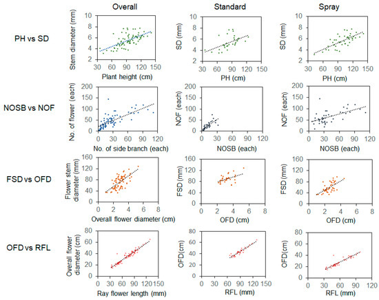 We also found a mild but significant positive relationship in PH vs. SD (rstandard = 0.537, rspray = 0.705), NOSB vs. NOF (rstandard = 0.739, rspray = 0.579), and FSD vs. OFD (rstandard = 0.490, rspray = 0.639) combinations. We noticed that the correlation of PH vs. SD and FSD vs. OFD in the spray is much stronger than the standard types, which would be useful in the spray breeding programs (Figure 3 and Figures S1–S3).