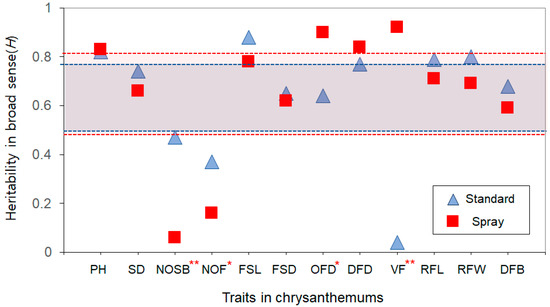 The estimation of broad-sense heritability among the horticultural traits of the standard and spray chrysanthemum lines of the study.