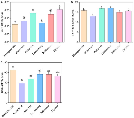 2.4. Effects of Six Maize Varieties on Detoxification Enzyme Activity of S. frugiperda