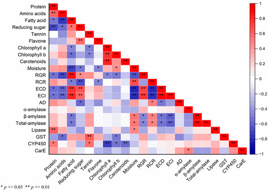 2.5. Correlation among Chemical Substances in Maize Leaves, the Nutritional Indices, Digestive, and Detoxifying Enzymes of S. frugiperda