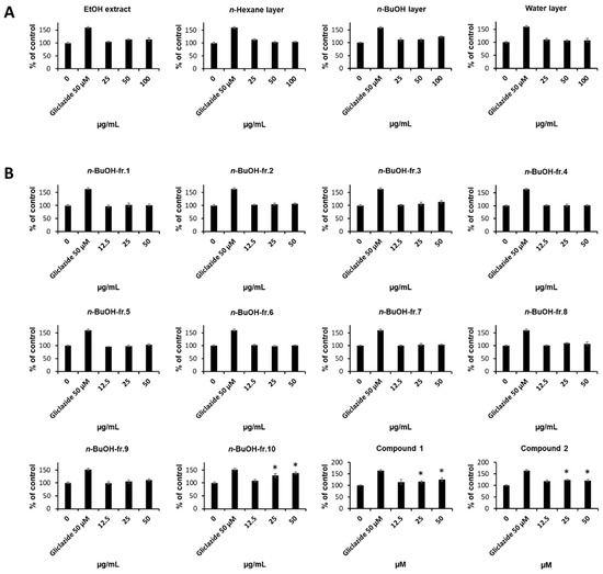 Effects of A. aethusifolius extract, solvent-partitioned fractions, and subfractions on the glucose uptake in C2C12 cells. Glucose uptake in C2C12 cells after 1 h incubation with (A) extract, solvent-partitioned fractions, and (B) subfractions, and 2-(N-(7-nitrobenz-2-oxa-1,3-diazol-4-yl) amino)-2-deoxyglucose (2-NBDG), assessed by glucose uptake assay. The indicated concentration of gliclazide was tested as a positive control for C2C12 cells. The data represent the mean ± S.E.M., n = 3, * p < 0.05 compared to the control.