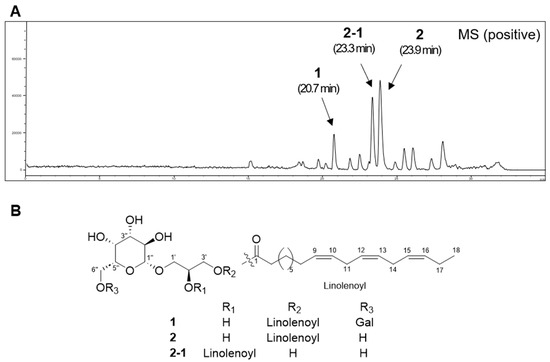 The molecular formula of compound 2-1 was the same as that of compound 2. The NMR data (Table 1) were also superimposable to those of compound 2, except for the NMR data pattern of the glycerol group [2: δC 71.9 (C-1′), 69.6 (C-2′), 66.6 (C-3′), δH 3.92 (1 H, dd, J = 10.5, 5.1 Hz, H-1′a), 3.65 (1 H, dd, J = 10.5, 4.6 Hz, H-1′b), 3.99 (1 H, m, H-2′), 4.15 (1 H, m, H-3′); 2-1: δC 68.8 (C-1′), 74.7 (C-2′), 61.7 (C-3′), δH 3.97 (1 H, dd, J = 10.8, 5.5 Hz, H-1′a), 3.75 (1 H, m, H-1′b), 5.05 (1 H, m, H-2′), 3.74 (1 H, m, H-3′)], suggesting that compound 2-1 was an sn-2 monoacylglycerol-type molecule, (2S)-2-linolenoylglycerol-O-β-d-galactopyranoside (Figure 2). This assumption was confirmed by the HMBC correlations from H-1′′ (δH 4.23) to C-1′ (δC 68.8) and from H-2′ (δH 5.05) to C-1 (δC 175.2). However, further analysis revealed that compound 2-1 rapidly interconverts with compound 2 through an acyl migration, which is a well-known reaction in monoacylglycerol. Their kinetics and equilibria depend on the structure, solvent, temperature, and pH. In our experiment, compound 2-1 was rapidly converted into a 90:10 mixture of 2:2-1 immediately after measuring the NMR data (pH 7), and we concluded that it was difficult to obtain compound 2-1 in a pure form [14]. The β-galactose moieties of compounds 1 and 2 were determined to possess a d-form (tR 19.9 min) by comparing with standard d-galactose (tR 19.9 min) and l-galactose (tR 20.2 min) using the HPLC method performed in the previous study (Figure S21).