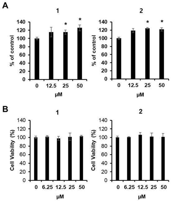 Although three monoacylglycerols were identified in the effective fraction, the 1,2-diacyl shift suggested that only two compounds (1 and 2) could be reliably tested in the bioassay system. To evaluate the ability of compounds 1 and 2 to enhance glucose uptake, a 2-(N-(7-nitrobenz-2-oxa-1,3-diazol-4-yl) amino)-2-deoxyglucose (2-NBDG) glucose uptake assay was performed in C2C12 skeletal muscle cells. Both compounds induced glucose uptake at 25 and 50 µM (Figure 3A). Furthermore, both compounds did not show cytotoxicity below the effective concentration of 50 µM (Figure 3B).