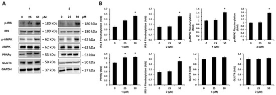 Effects of compounds 1 and 2 on the protein expression levels of phospho-insulin receptor substrate-1 (P-IRS-1), IRS-1, phosphorylated-5′-AMP-activated protein kinase (p-AMPK), AMPK, peroxisome proliferator-activated receptor γ (PPARγ), and glucose transporter type 4 (GLUT4). (A) p-IRS-1, IRS-1, p-AMPK, AMPK, PPARγ, GLUT4, and glyceraldehyde 3-phosphate dehydrogenase (GAPDH) in C2C12 cells treated or untreated with 25 and 50 μM of compounds 1 and 2. (B) Each bar graph presents the densitometric quantification of Western blot bands. The data represent the mean ± S.E.M., n = 3. * p < 0.05 compared to the control.