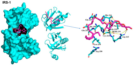 Docking model for IRS-1 (PDB ID:1QQG). The receptor and ligand are shown in cartoon (cyan color) and stick (magenta color), respectively.