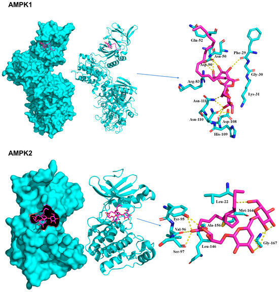 Docking models for AMPK1 and AMPK2 (PDB ID: 6C9H and 3AQV). The receptor and ligand are shown in cartoon (cyan color) and stick (magenta color), respectively.