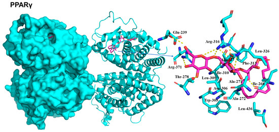 Docking model for PPARγ (PDB ID: 1FM9). The receptor and ligand are shown in cartoon (cyan color) and stick (magenta color), respectively.