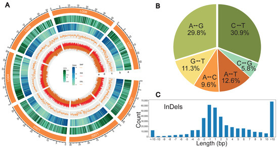 SNPs and InDels screening and in silico simulation. (A) Genome-wide variation distribution. Tracks toward the center: a, CG content (%); b, number of genes; c, number of SNPs; d, number of insertions; e, number of deletions. (B) Proportion of six variant types of SNPs in the whole population. (C) Distribution of InDel lengths.