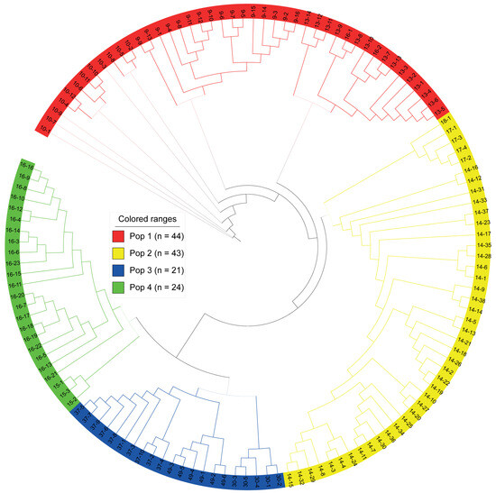 To infer relationships among the 132 accessions of R. chingii, a neighbor-joining (NJ) tree was constructed. PLINK software (version 3.696) was utilized with VCF files to calculate squared genetic distances between individuals based on SNP data. Four subgroups were generated from this NJ tree. Pop1 (red in Figure 2) included all the resources in populations 9, 10 and 13 and two accessions in population 16, while the genetic structure of populations 14, 17 and 18 showed a closer relationship to Pop2 (yellow in Figure 2). Pop3 (blue in Figure 2) consisted of 21 accessions from three populations: 30; 37; and 49. Pop4 (green in Figure 2) comprised 24 accessions, population 15 and the remaining 21 accessions of population 16. In general, except for a small internal division from population 16, individuals from every other population clustered on the same genetic branch.
