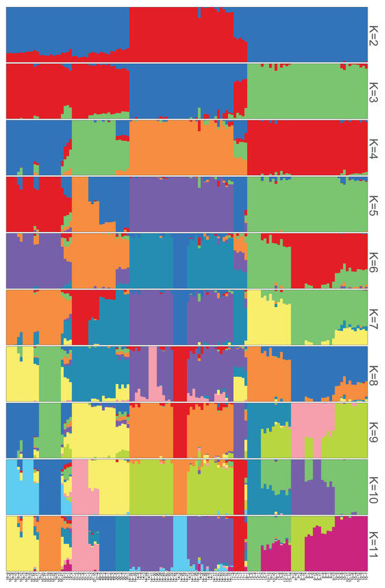 Population structure of 132 R. chingii accessions at K = 2–11. The square columns represent samples; the colors correspond to the origins of the ancestors, and the proportions of the colors represent the proportions of the ancestries in the sample.