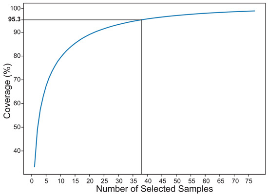 In this research, the core germplasms of R. chingii were constructed from 132 wild accessions using a combination of Hyper-seq technology and Genocore [48]. According to the NJ tree, there are 21 accessions in Pop1, accounting for 27.3%; 28 accessions in Pop2, accounting for 36.4%; only 14 accessions in Pop3, accounting for 18.2%; and 14 accessions in Pop4, accounting for 18.2%. Furthermore, 38 accessions of R. chingii samples were chosen from the core set if the sample was 50% (Table 3); the genotype coverage is 95.3% (Figure 5, Supplementary Table S8), and Pop2 contains 14 accessions, reaching the maximum of 36.8%. At this time, the noncore germplasm contains 27 strains. The percentage of polymorphic sites of the core germplasm population is 91.5%; the effective allele number is 1.4293, and the Shannon’s information is 0.6192. Nei’s gene diversity is 0.6341, higher than that in the noncore germplasm set. The average observed heterozygosity of the core germplasm population is 0.1833, which is slightly lower than that of the noncore germplasm sets.
