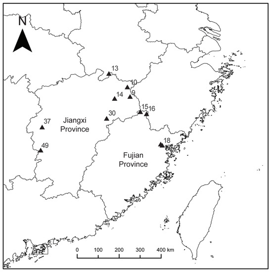 Geographic distribution map of 11 populations of R. chingii from Jiangxi and Fujian provinces of China.