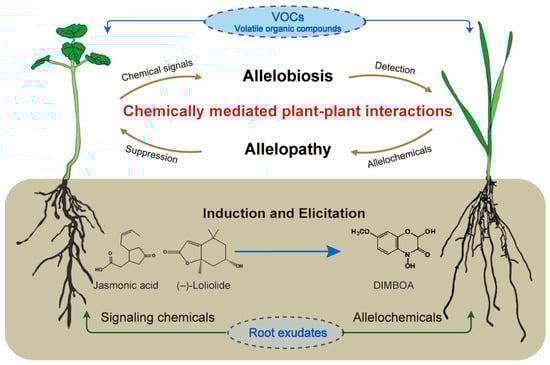 Allelobiosis originated from volatile-mediated aboveground signaling interactions that have been investigated in greater detail [7,89,90]. However, a great deal of recent attention has been paid to root exudate-mediated belowground signaling interactions among plant species [16,84,91,92]. Accordingly, allelobiosis reasonably extends to plant–plant belowground signaling interactions mediated by root-secreted chemical signals. Allelobiosis refers to the communication among plants through phytochemicals, carrying valuable information that transmits signals between adjacent plants, thereby influencing plant growth, defense, and reproduction. However, the use of the term allelobiosis is relatively limited because allelobiosis shares conceptual similarities with plant chemical communication and signal transduction. Plant chemical communication sometimes includes allelochemical interactions. A few allelochemicals, such as benzoxazinoids and momilactones, may also serve both roles of toxic inhibitors and nontoxic signals [93,94]. Whereas allelobiosis places a stronger emphasis on the role of non-toxic signaling chemicals with an informative value for co-occurring plants, highlighting a specific contribution to chemically mediated plant–plant interactions. Accordingly, allelobiosis in the context of plant–plant interactions is orchestrated by signaling chemicals, operating in both aboveground and belowground components, influencing intra-specific and inter-specific dynamics within plant populations.