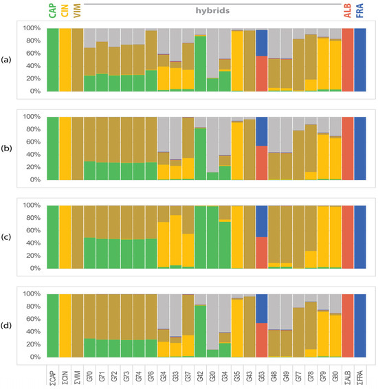 Frequency of species-specific markers in the Vetrix hybrids (CCV dataset). (a) All SSM: proportion of all detected species-specific markers present at least in 1 sample of the species; (b) SSM > 50%: proportion of SSM present in >50% of samples of the species; (c) proportion of SSM present in >50% of samples of the species proportioned to average number of SSM per sample of the species; (d) proportion of SSM present in >50% of samples of the species proportioned to total number of SSM of the species. Samples G37 and G78 were identified as hybrids S. cinerea × S. viminalis, samples G71–G76 as S. caprea × S. viminalis. Samples G48 and G49 appeared to be hybrids of S. viminalis with other species, Figure 2 shows that unknown parent is S. purpurea. Samples G24, G33, G42, G20, G79, and G80 remain unidentified, representing hybrids of S. caprea (G20 and G42), S. viminalis (G77), S. cinerea (G79 and G80), or S. ×holosericea (syn. S. ×dasyclados) with other unidentified species. Sample G53 was identified as S. ×rubens. Legend to taxa: CAP = S. caprea; CIN = S. cinerea; VIM = S. viminalis; ALB = S. alba; FRA = S. fragilis; none = markers present in hybrids only not belonging to any species of the CCV or AF dataset.